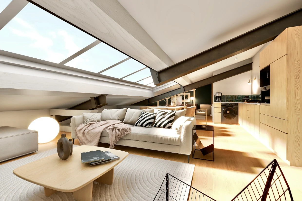 Exemple : rendu photoréaliste du salon, angle identique, textures conservées, golden hour, style magazine déco.